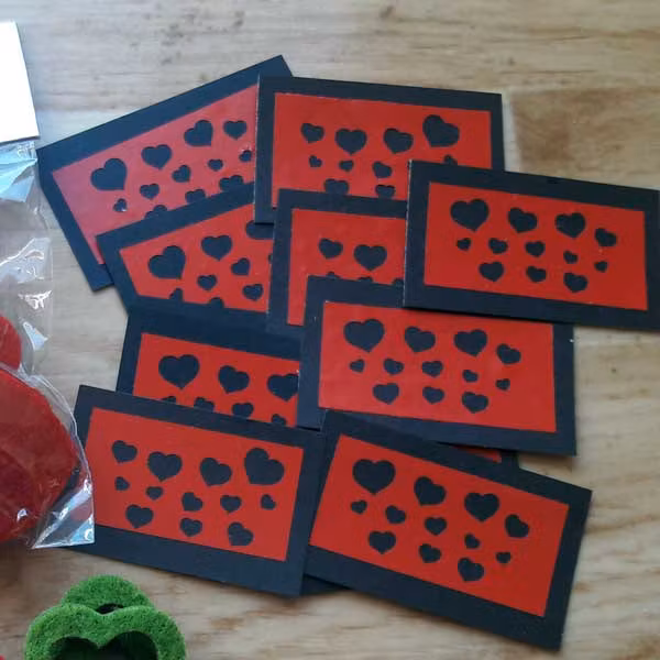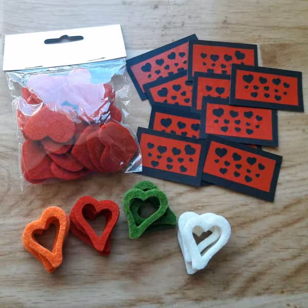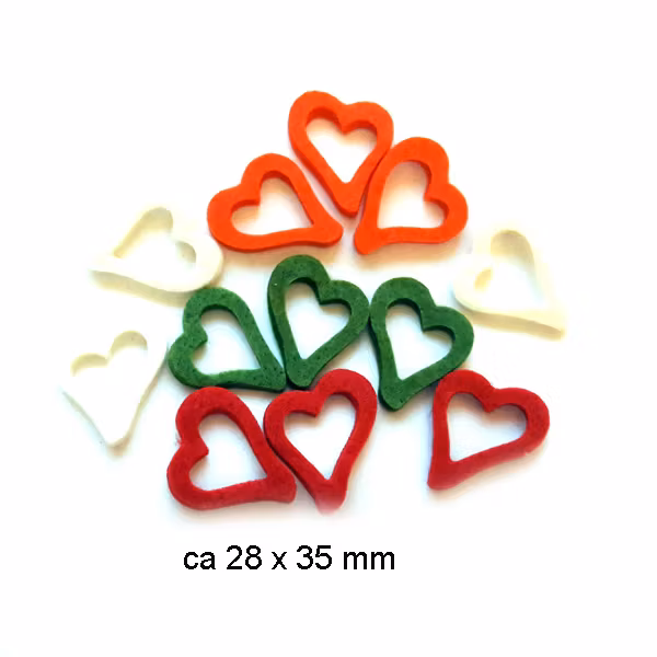 * ca 12 st hjärtan i filt - 4 olika färger: röd, vit, grön och orange