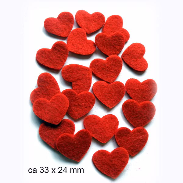 * ca 25 st röda hjärtan i filt - ca 33 x 24 mm